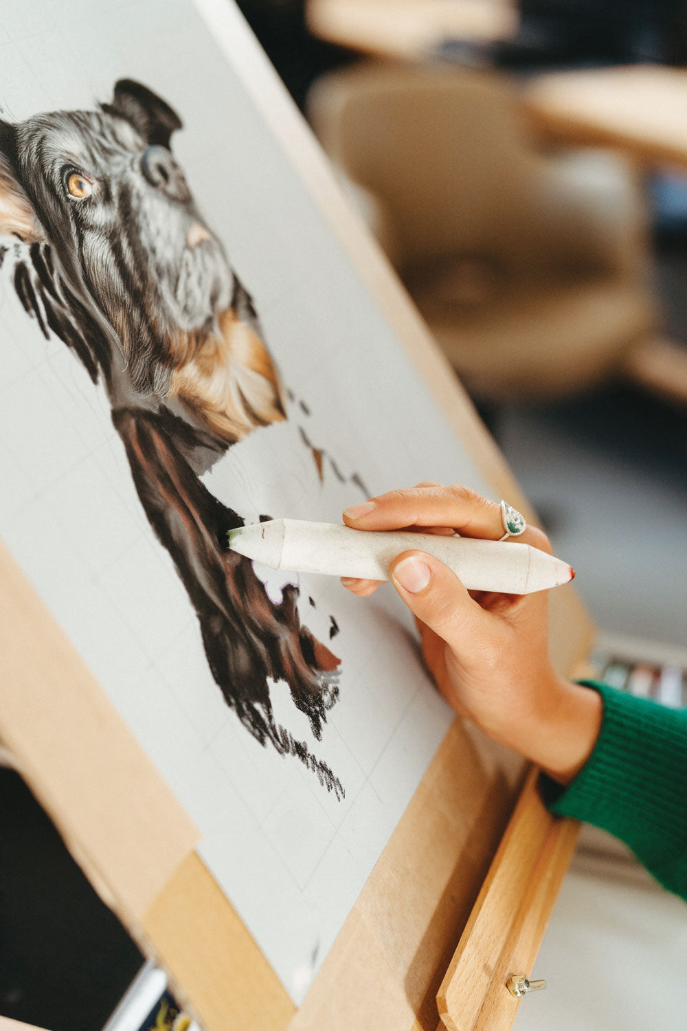 Each custom pet portrait is a unique, handcrafted artwork made with traditional materials. If you desire extra copies to share with loved ones, your original artwork can be professionally scanned and transformed into a giclée fine art print. The digital file can be saved, shared on social media, or emailed as a delightful image of your pet.