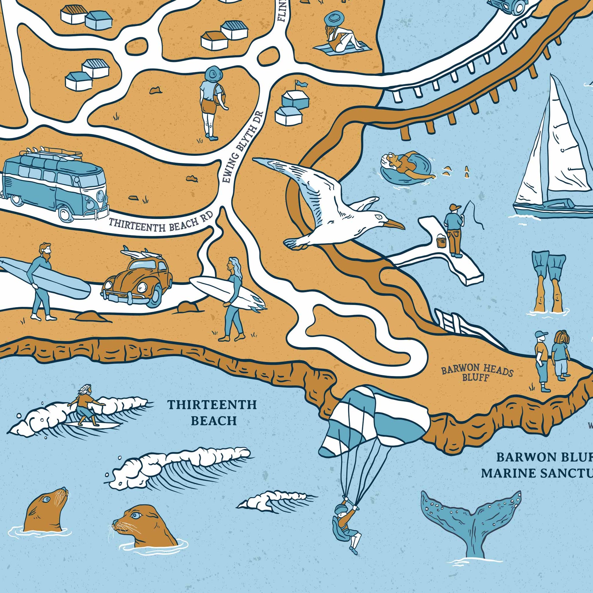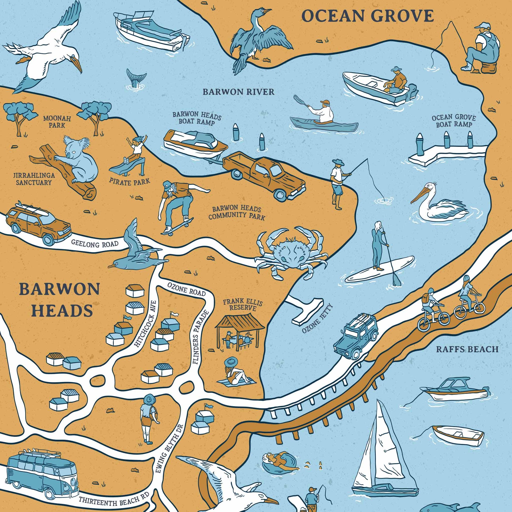 Illustrated map of Barwon Heads & Ocean Grove. Showcasing the character and quirks of the places we live and explore. The Barwon Heads map makes a perfect gift, special memento or bright addition to your home.