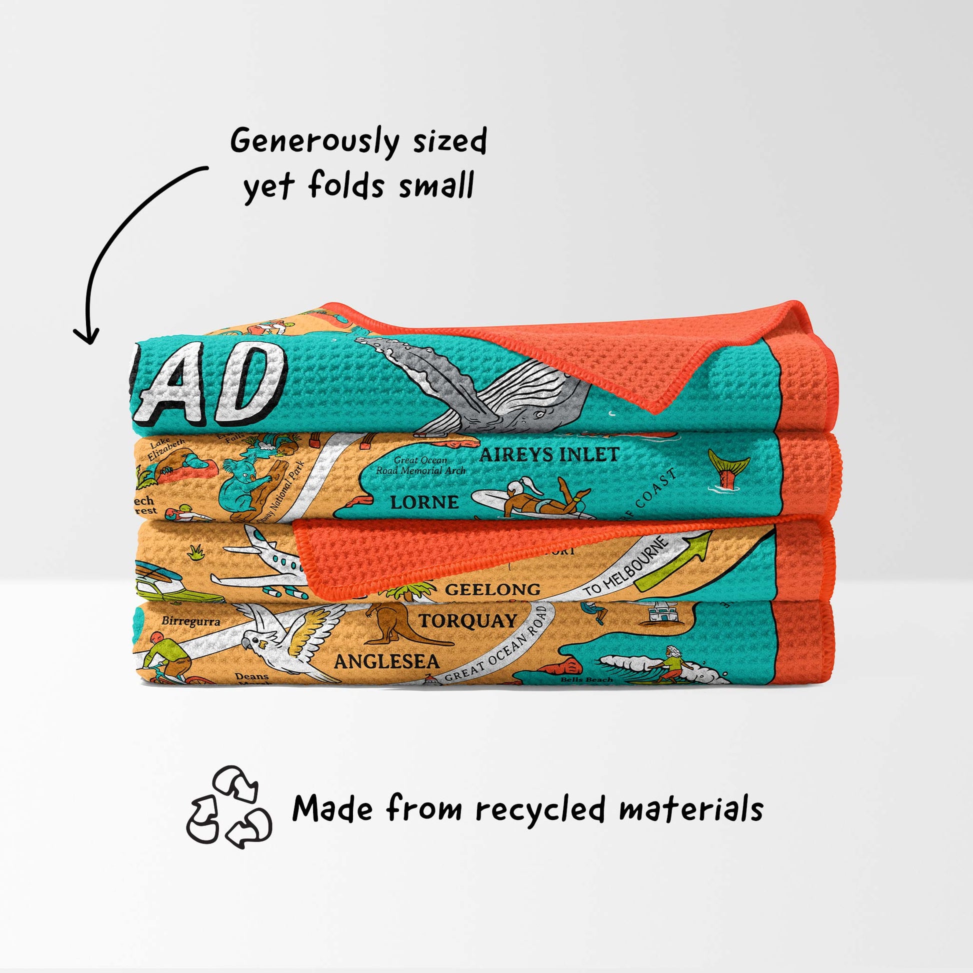 Bring a piece of the Great Ocean Road home with an illustrated, beach towel map!