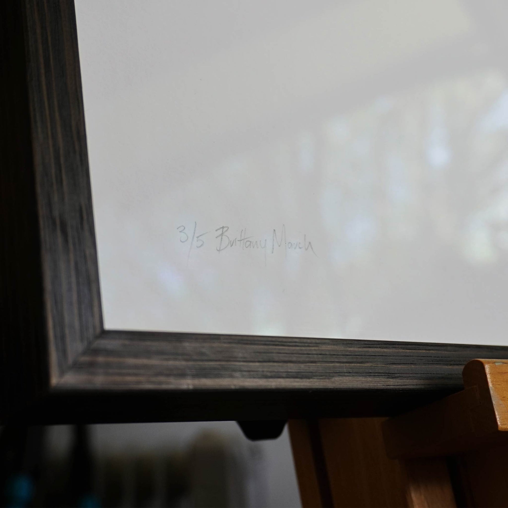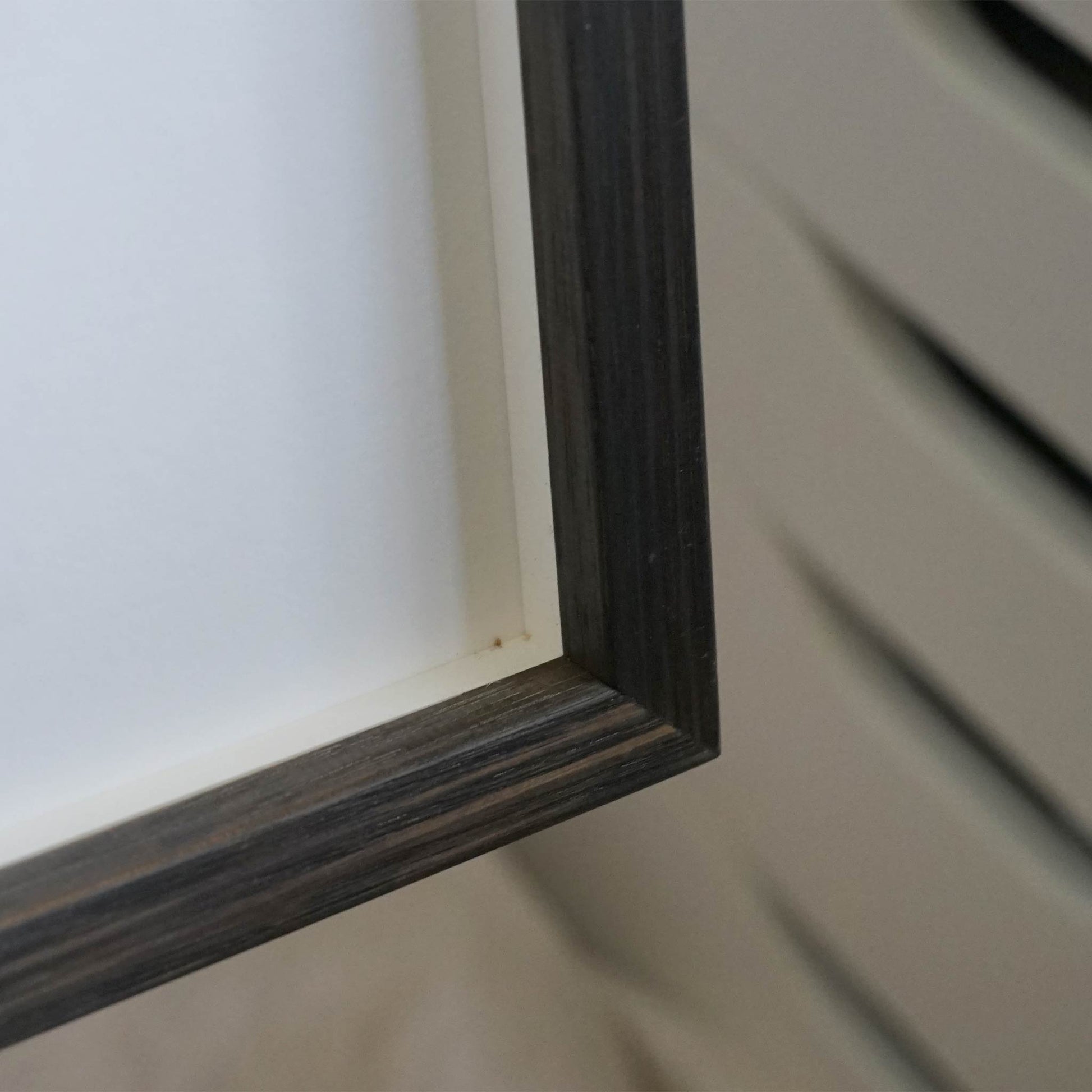 Framed behind museum grade glass in a stained black wood profile.