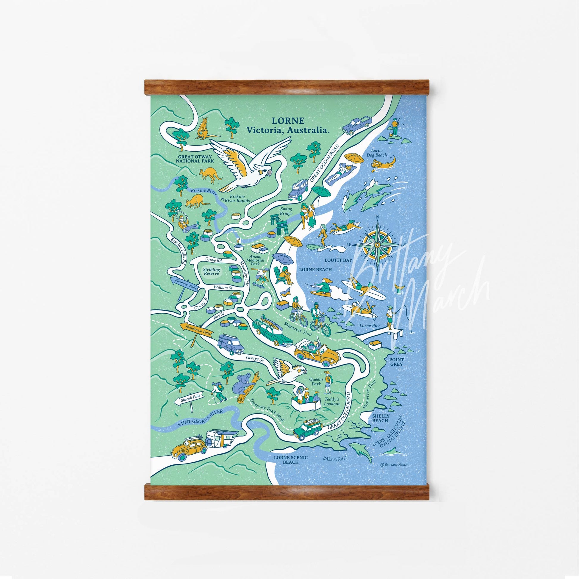 Illustrated map of Lorne on the Surf Coast, Victoria — a celebration of the character, charm and quirks of the places we live and explore. This much-loved artwork is now available as a premium A1 canvas print, offering a bold, beautiful way to bring the coast into your home.