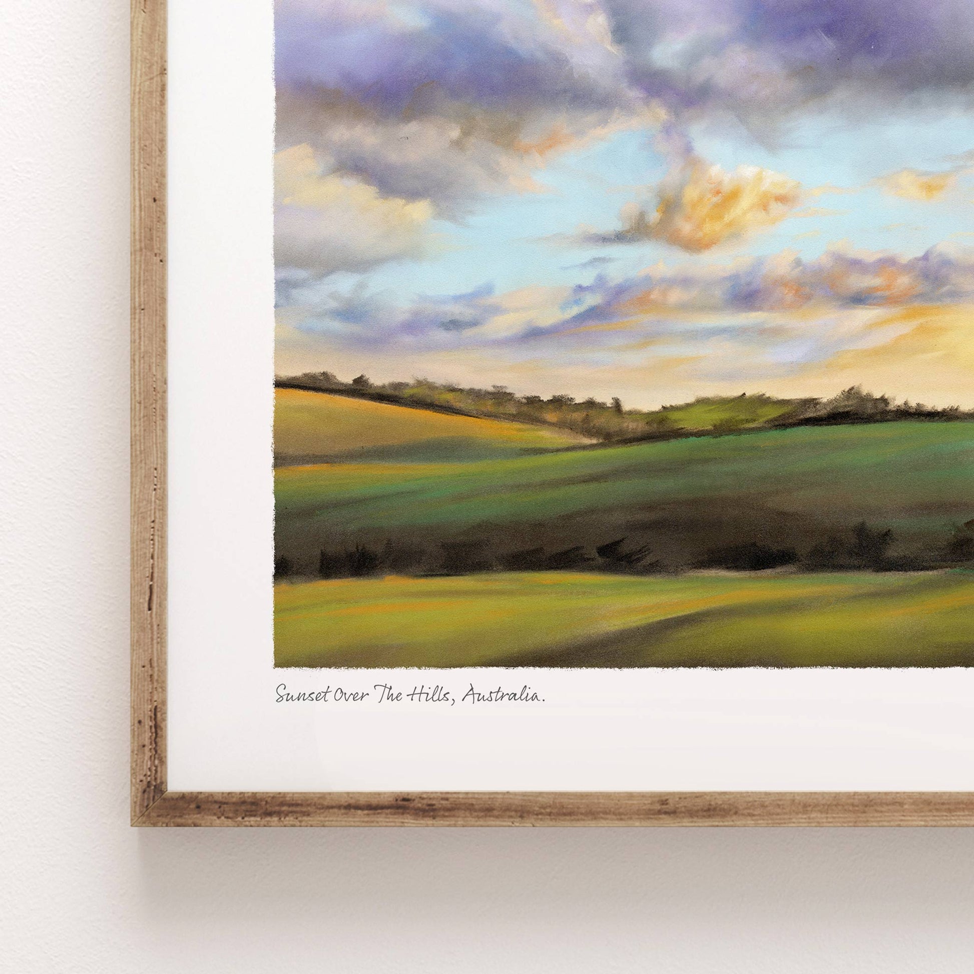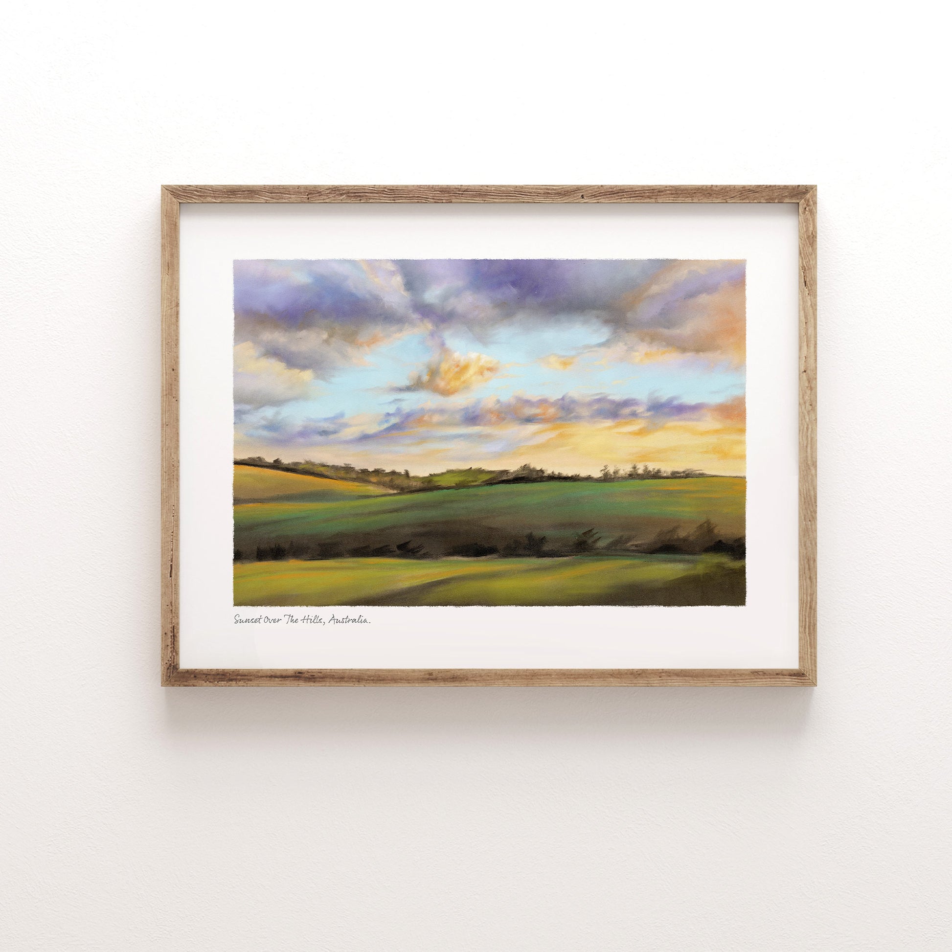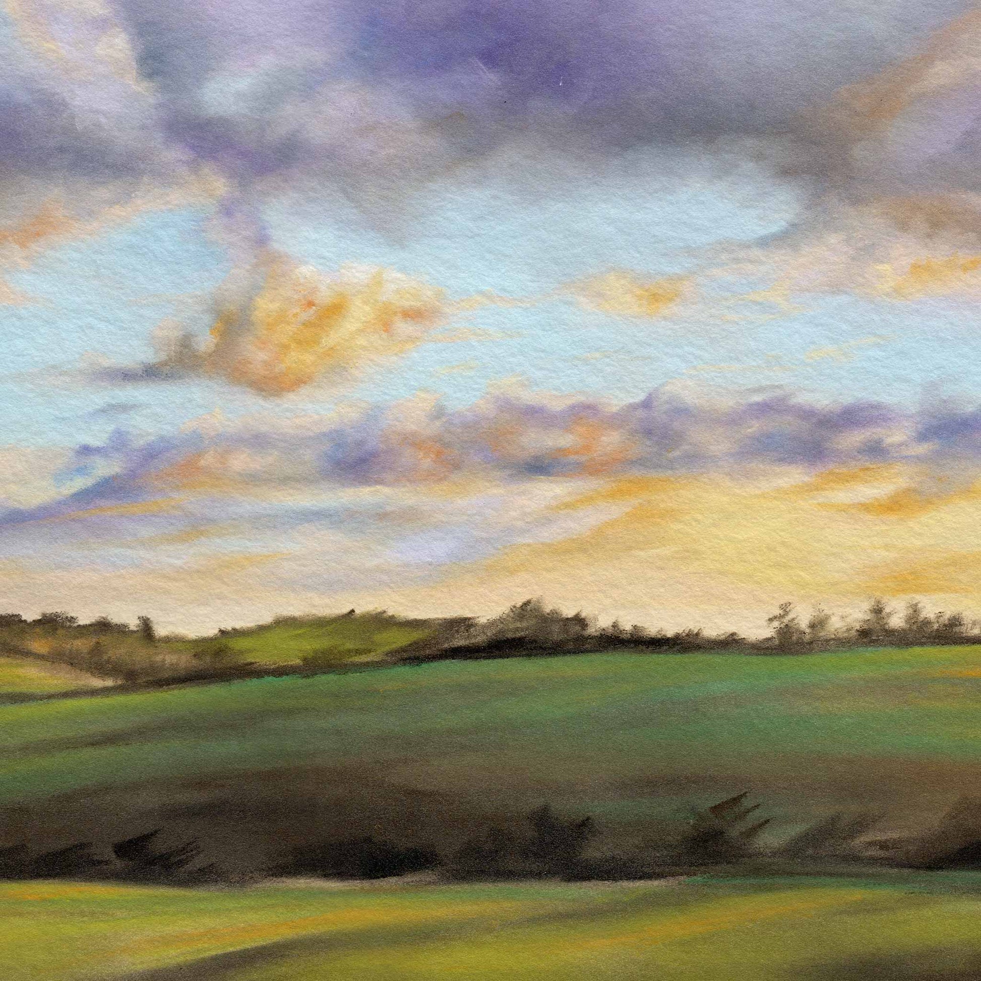 Rolling hills bathed in warm sunset hues. Internationally acclaimed soft pastel artist Brittany March presents this fine art print of her original landscape, perfect for bringing a sense of calm to any space.